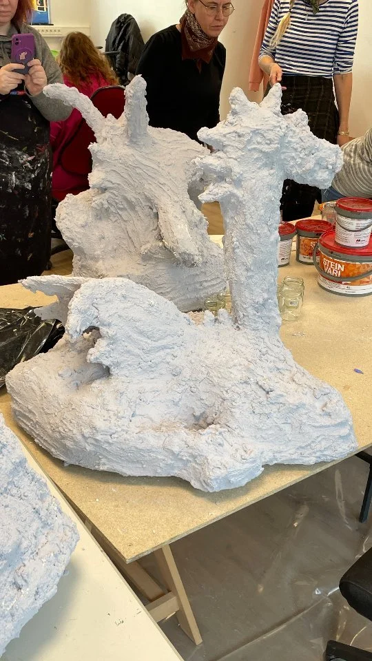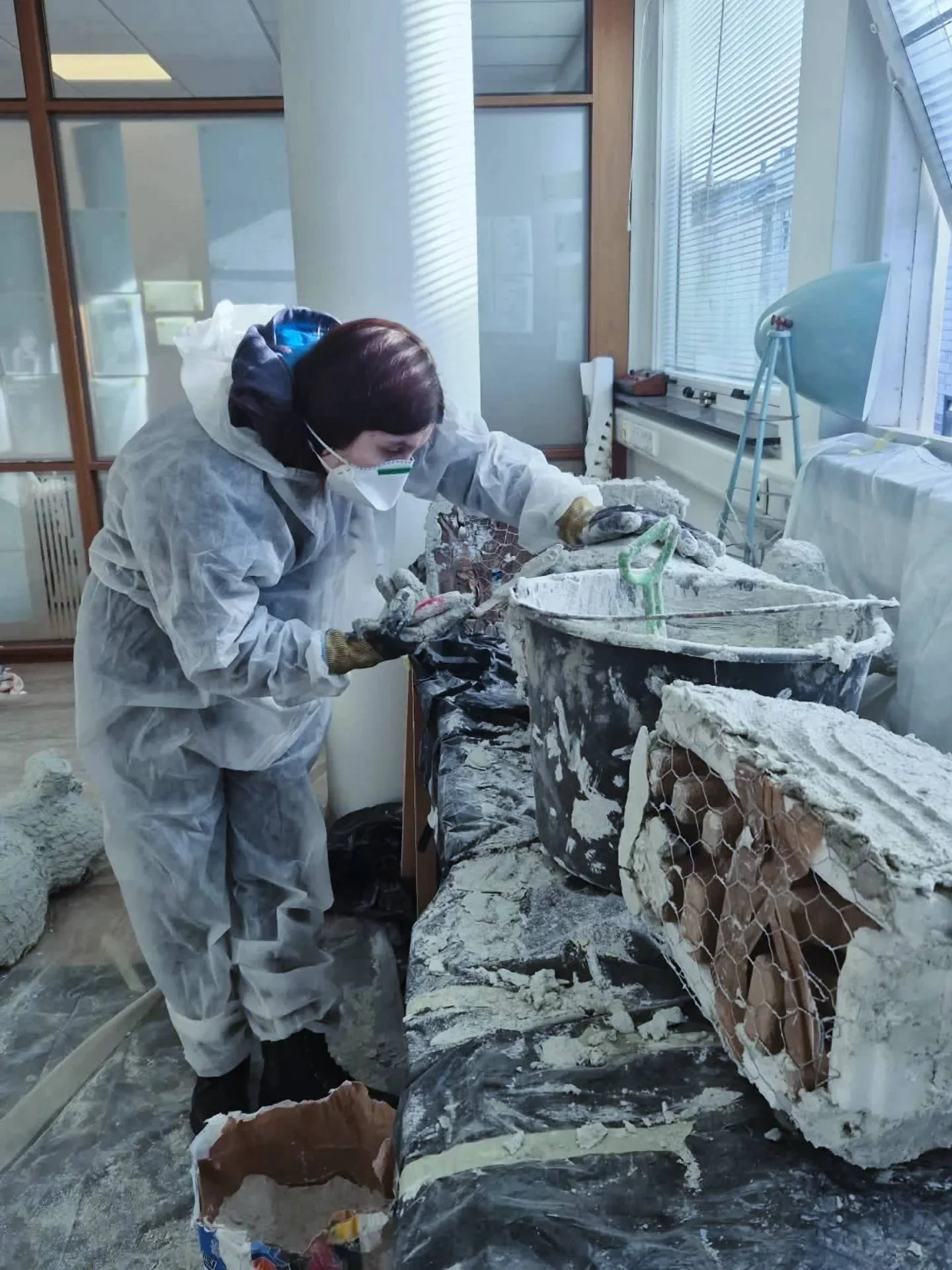 Listafólk vinnur að gerð skúlptúra, frá grunni: Skissa - beinagrind - Hænsnavír. Næst er það múr og málning.